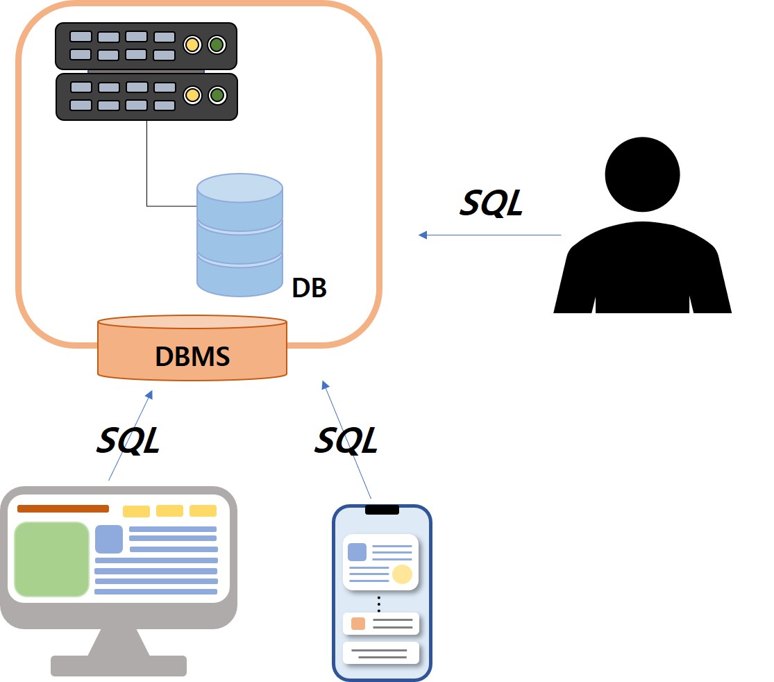 응용 프로그램에서는 SQL를 통해 데이터에 대한 사용자의 검색, 추가, 수정, 삭제 요청을 처리할 수 있고, DBMS 관리 프로그램에서는 SQL를 통해 데이터베이스 관리자가 구축된 데이터베이스에 대한 관리 작업 및 분석작업 등을 할 수 있다.