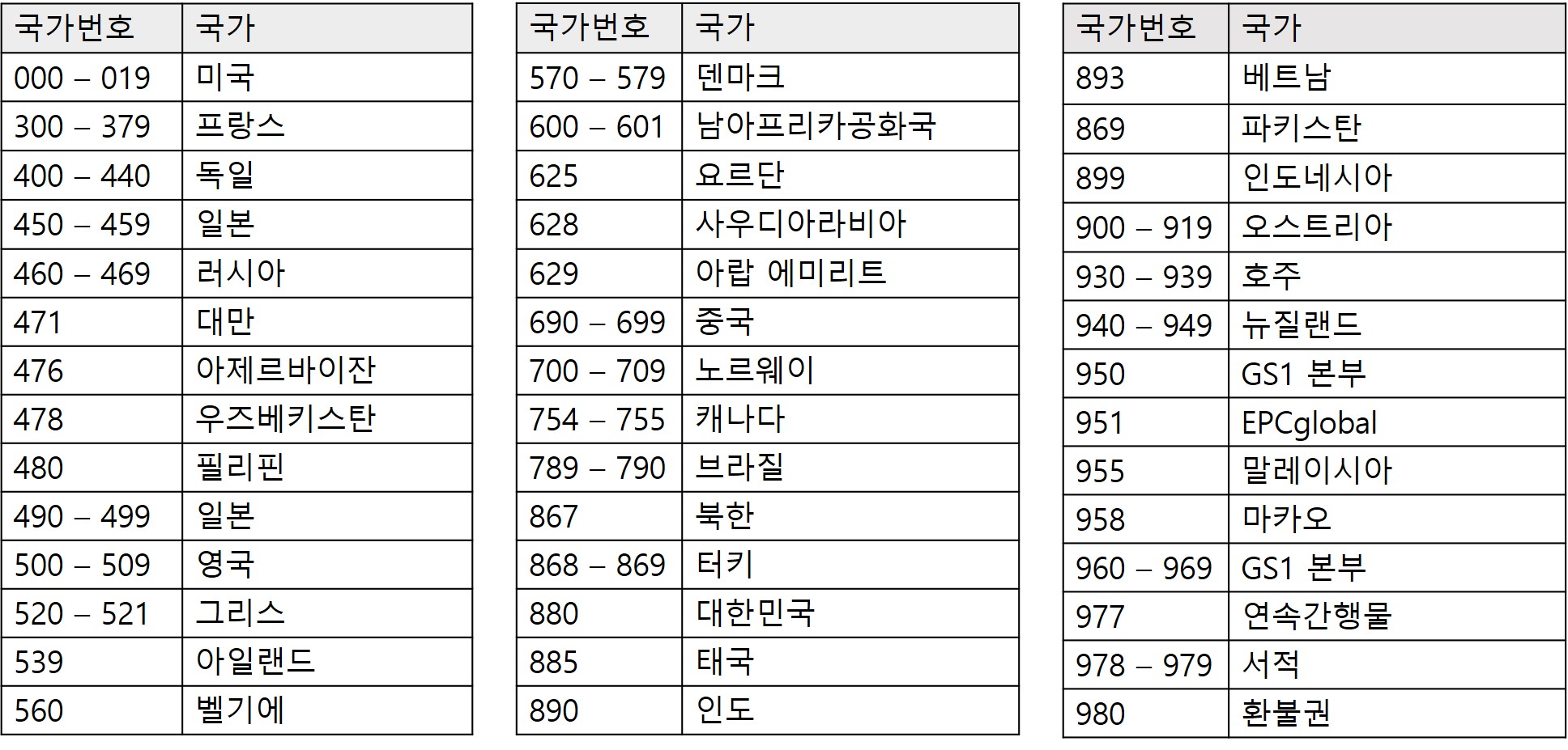국가별 바코드 번호는 다음과 같다.