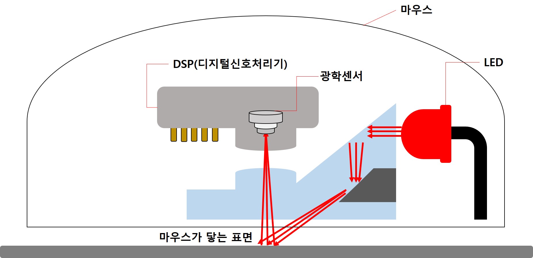 먼저 광마우스 내부의 LED를 통해 빨간색 빛을 비스듬하게 바닥에 쏜다.