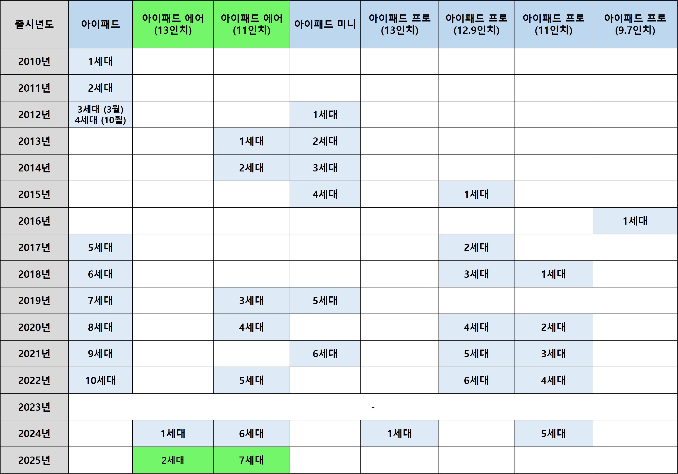 아이패드는 2010년 기본모델을 최초 출시한 이후 3종류가 추가되어 현재까지 출시되고 있다.