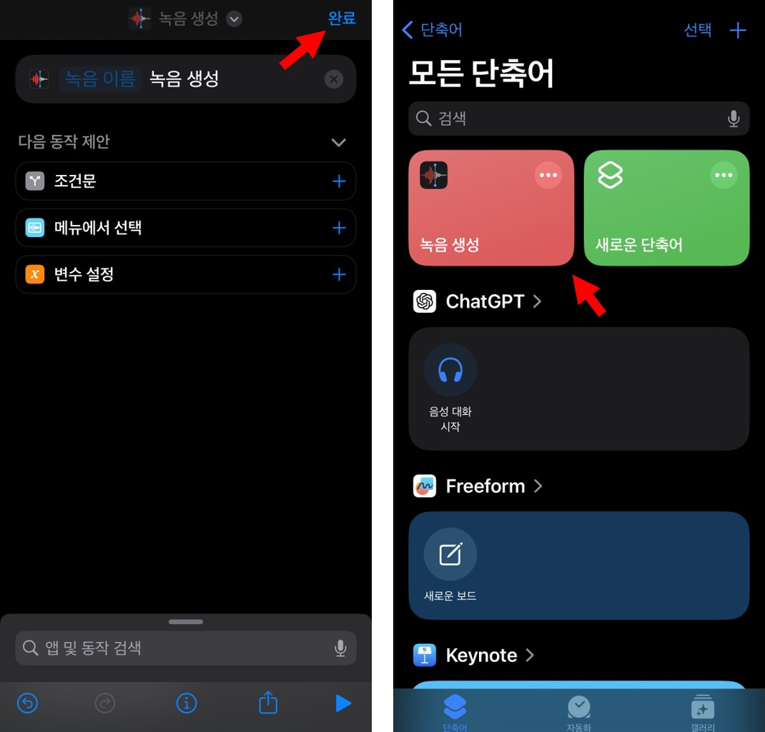그 후 우측 위의 '완료'를 누르면 다음과 같이 녹음생성 단축어가 생성된 것을 볼 수 있다.