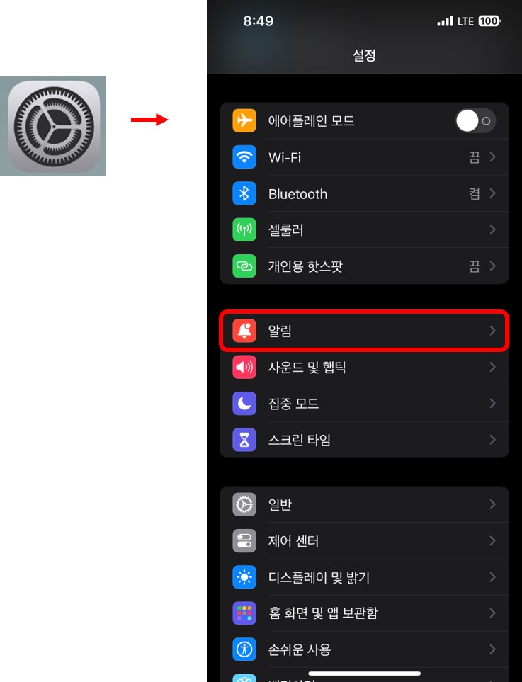 [ 설정 - 알림 ]으로 들어간다.