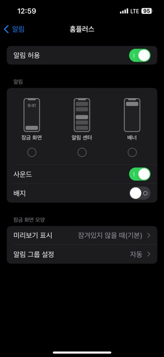 이때 파란색으로 표시되는 '알림' 표시 설정을 보면 '잠금화면', '알림 센터', '배너' 모두 체크가 되어 있는 것을 볼 수 있고 아래에 사운드 및 배지 표시가 ON 되어 있는 것을 확인할 수 있다.