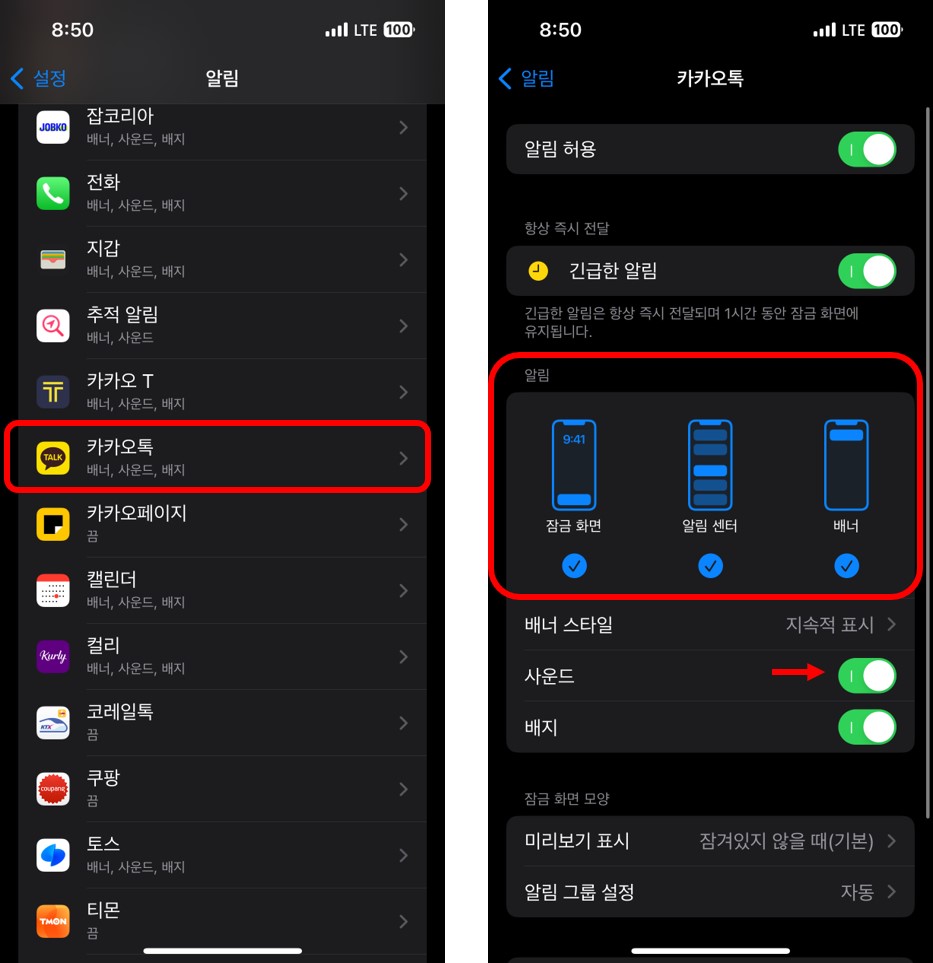 즉, 현재 해당 아이폰의 카카오톡은 사운드 및 진동 알림과 함께 아이폰이 잠금화면이든 열린 상태이든 새로운 알림을 표시해 준다는 것이다.