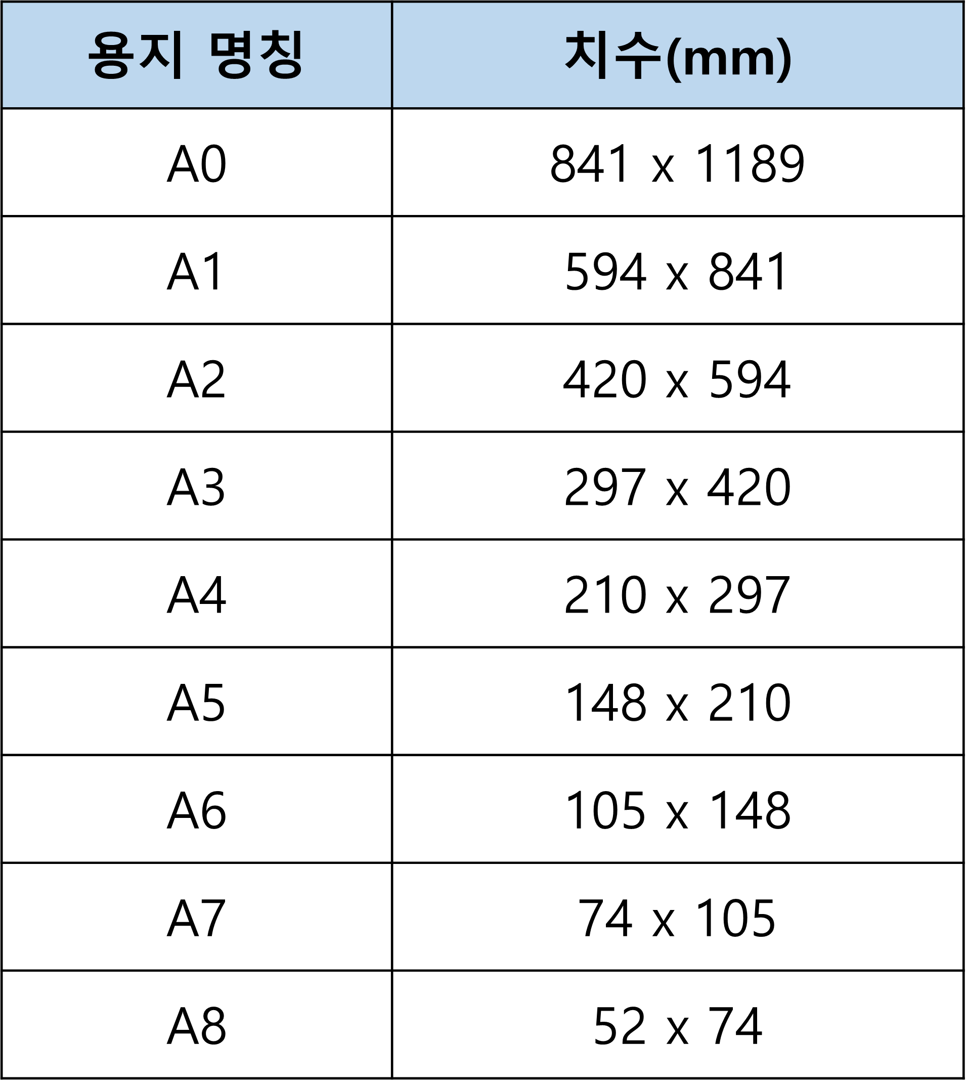 A 뒤의 숫자가 작을수록 용지의 사이즈는 커지고, 숫자가 커질수록 용지의 사이즈는 작아진다.