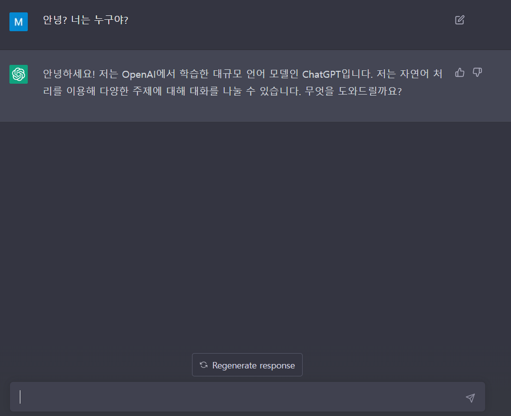 무료버전과 유료버전의 질문에 대한 대답 결과는 동일하지만 좀 더 빠른 응답 시간과 새로운 기능을 사용하고 싶다면 유료버전 Chat GPT를 사용하면 되겠다.