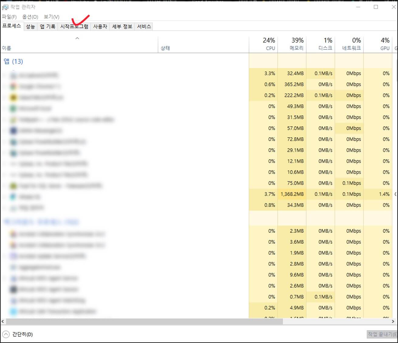 그 후 작업관리자 창이 나타나면 상단 4번째 항목인 '시작프로그램' 을 눌러 들어간다.