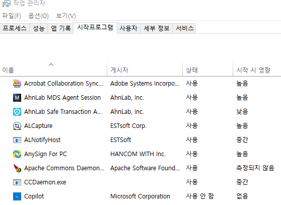 [ 작업관리자 - 시작프로그램 ]으로 들어가면 현재 PC에 설정된 시작 프로그램들을 볼 수 있다. 굳이 부팅 시 사용하지 않는 프로그램인 경우에는 상태 설정을 '사용 안 함'으로 설정해 두는 것이 좋다.