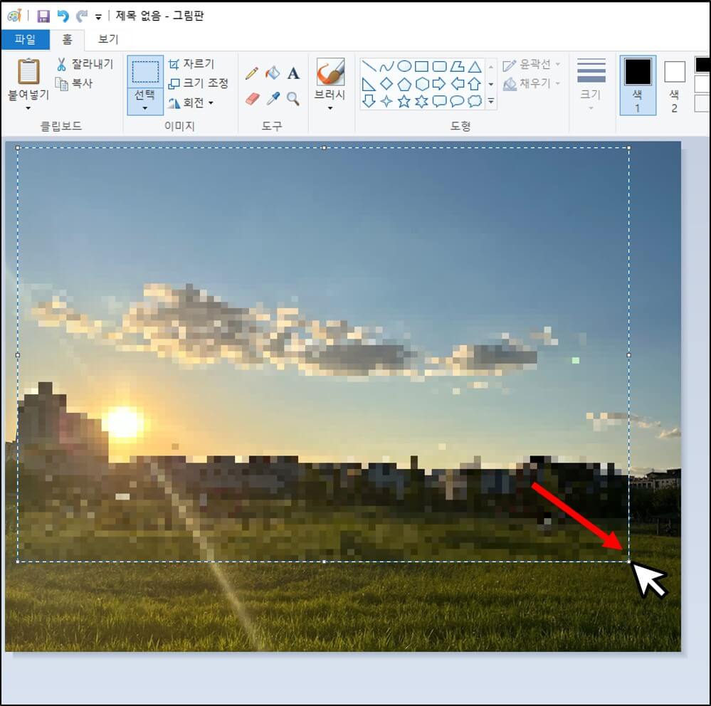 축소한 부분의 우측 아래를 다시 늘려 원래 사이즈로 복귀시키면 선택한 부분의 화질이 깨지면서 모자이크 처리가 되는 결과를 볼 수 있다.