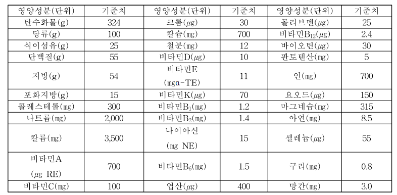 식품의약품안전처에서는 1일 영양성분 기준치를 아래와 같이 정리해주었다.