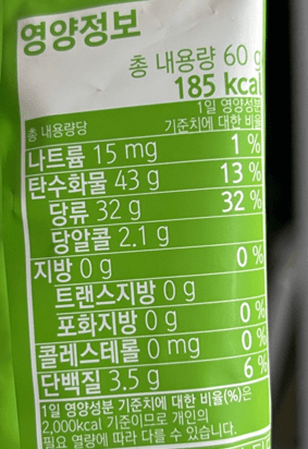 위 사진의 영양정보를 보면 탄수화물은 43g, 당류는 32g이라고 적혀있다.