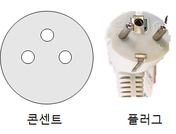 특징 : 3개의 원형 핀으로 이루어져 있으며, 원형 접지핀이 존재한다.