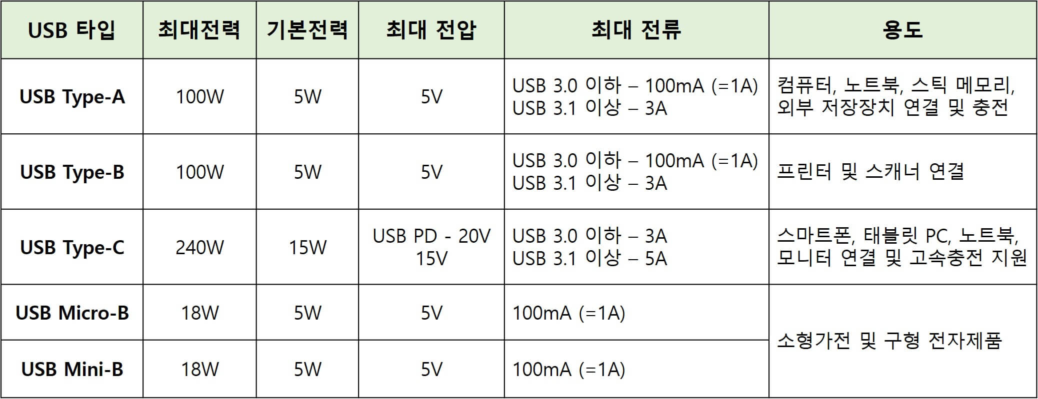 각 USB 타입별 충전 전력량은 다음과 같다.