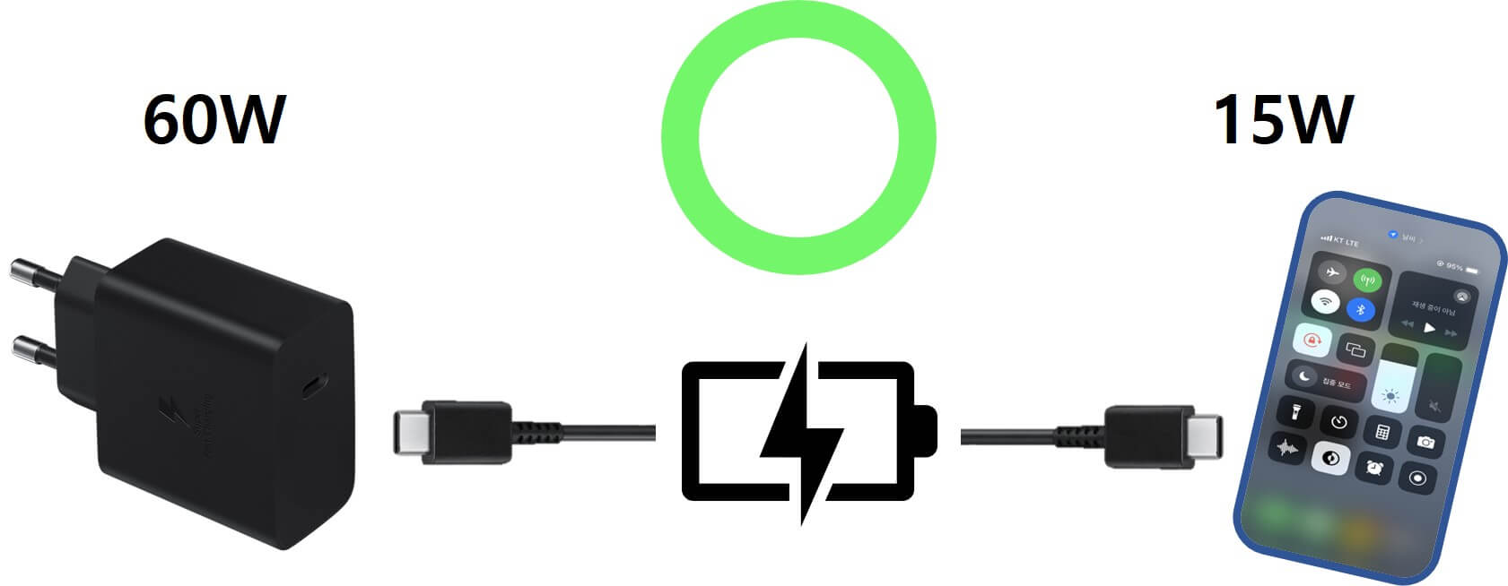 60W 충전기를 사용하여 스마트폰을 충전하더라도 충전 시에 전력은 10W로 자동 변환되므로 스마트폰의 배터리가 충전되는 것이다.