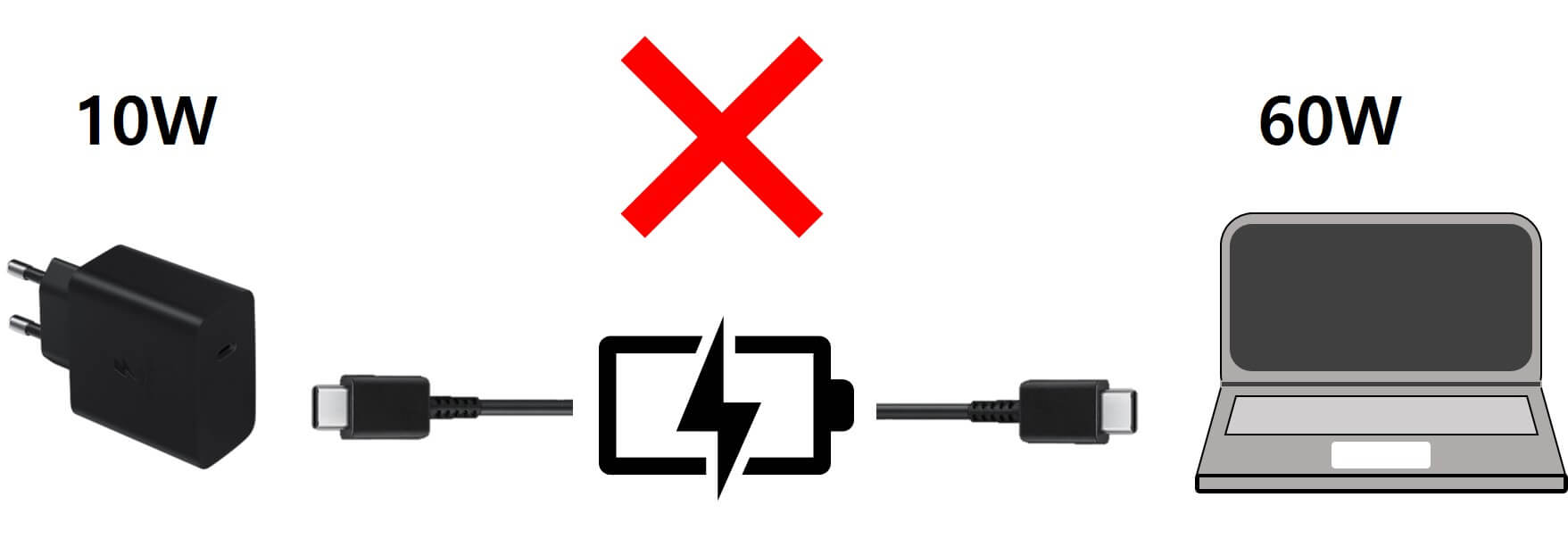 반대로 10W 출력의 충전기로 60W 노트북을 충전하는 것은 불가능하다.