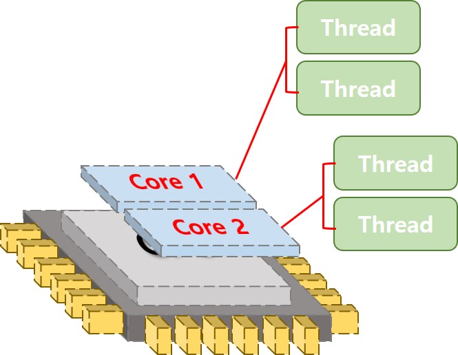 1개의 코어가 1개 쓰레드를 처리하던 기존 방식에서 요즘은 소프트웨어적으로 이 쓰레드를 한 번에 여러 개 실행하여 1개 코어가 여러 작업을 처리할 수 있도록하는 멀티쓰레딩 기술이 기본적으로 사용되고 있다. 따라서 많은 수의 코어를 갖춘 CPU라 할지라도 이 쓰레드 기술을 활용하지 못한다면 최대한의 성능을 발휘하지 못한다.