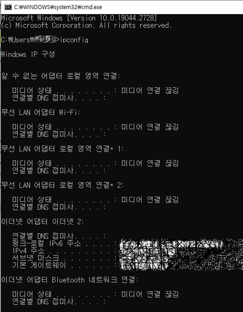 Winodws 운영체제를 사용하고 있는 경우 IP주소는 다음과 같이 확인하면 된다.