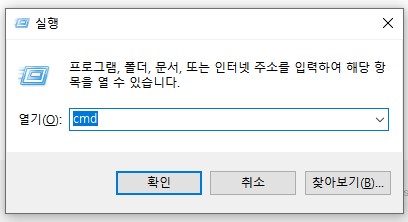 - 실행창에서 "cmd" 라고 친 뒤 확인을 누른다.