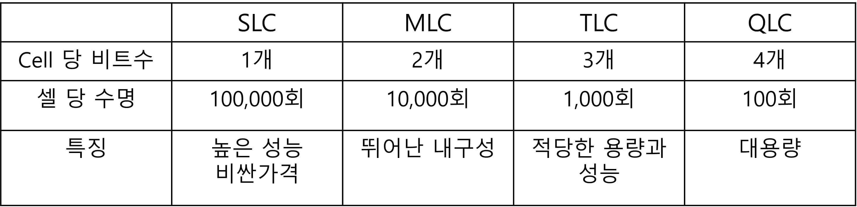 즉, 한 개의 셀을 사용하는 빈도가 SLC보다 많아지게 되므로 메모리 수명이 차이가 난다.